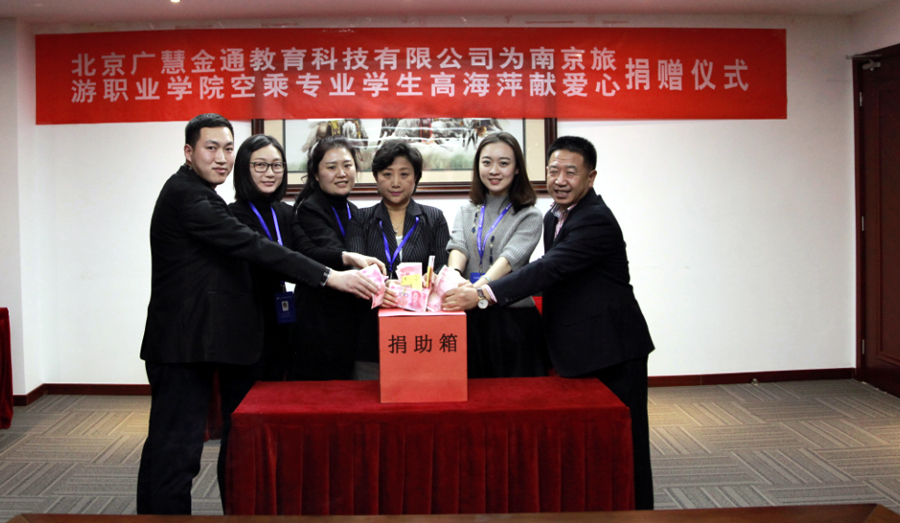 在得知南京旅游職業(yè)學(xué)院153空中乘務(wù)二班的高海萍同學(xué)被確診為急性淋巴細(xì)胞白血病這一情況后,2016年12月1日,北京廣慧金通教育科技有限公司北京總部全體員工舉行了為高海萍同學(xué)籌集善款的活動(dòng)。公司總部全體員工紛紛傾情解囊,為家庭困難、病情嚴(yán)重,且已進(jìn)入第一個(gè)化療療程的高海萍捐助善款,共計(jì)14500元。