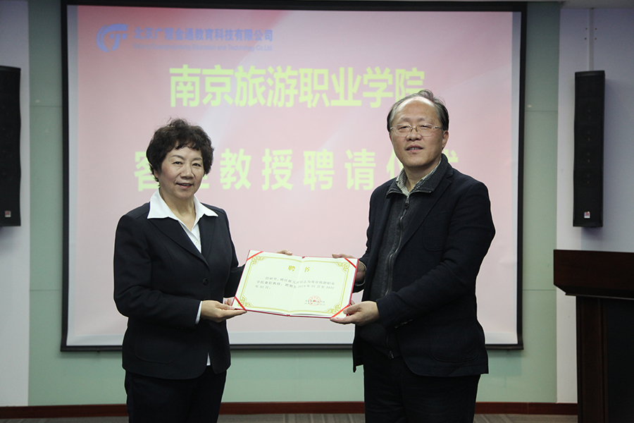 會議最后,王海平書記代表南京旅游職業(yè)學(xué)院向北京廣慧金通教育科技有限公司董事長焦殿成與總經(jīng)理郝玉萍頒發(fā)了南旅乘務(wù)學(xué)院客座教授證書。